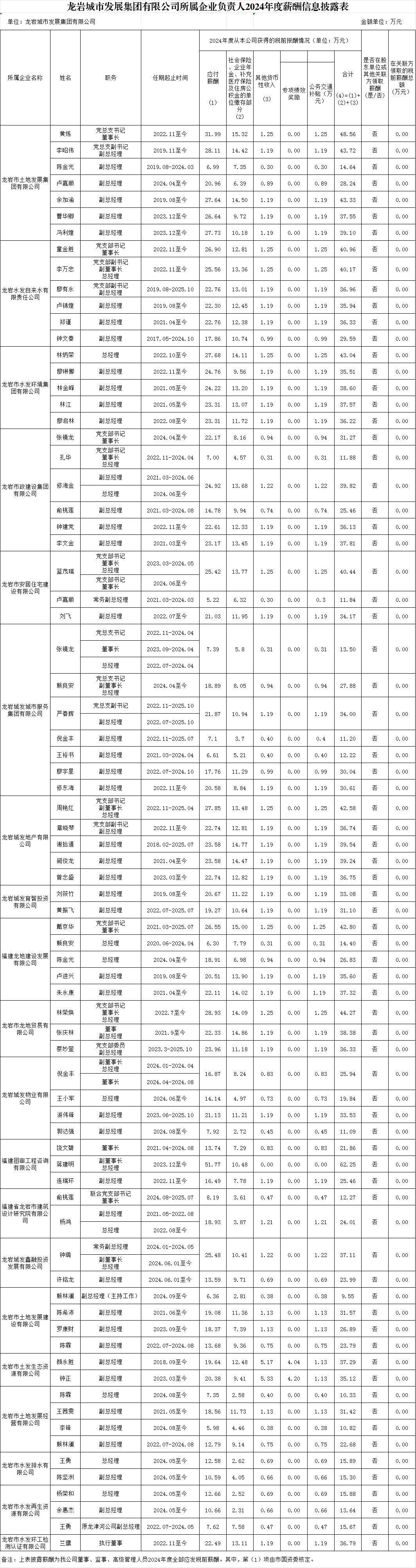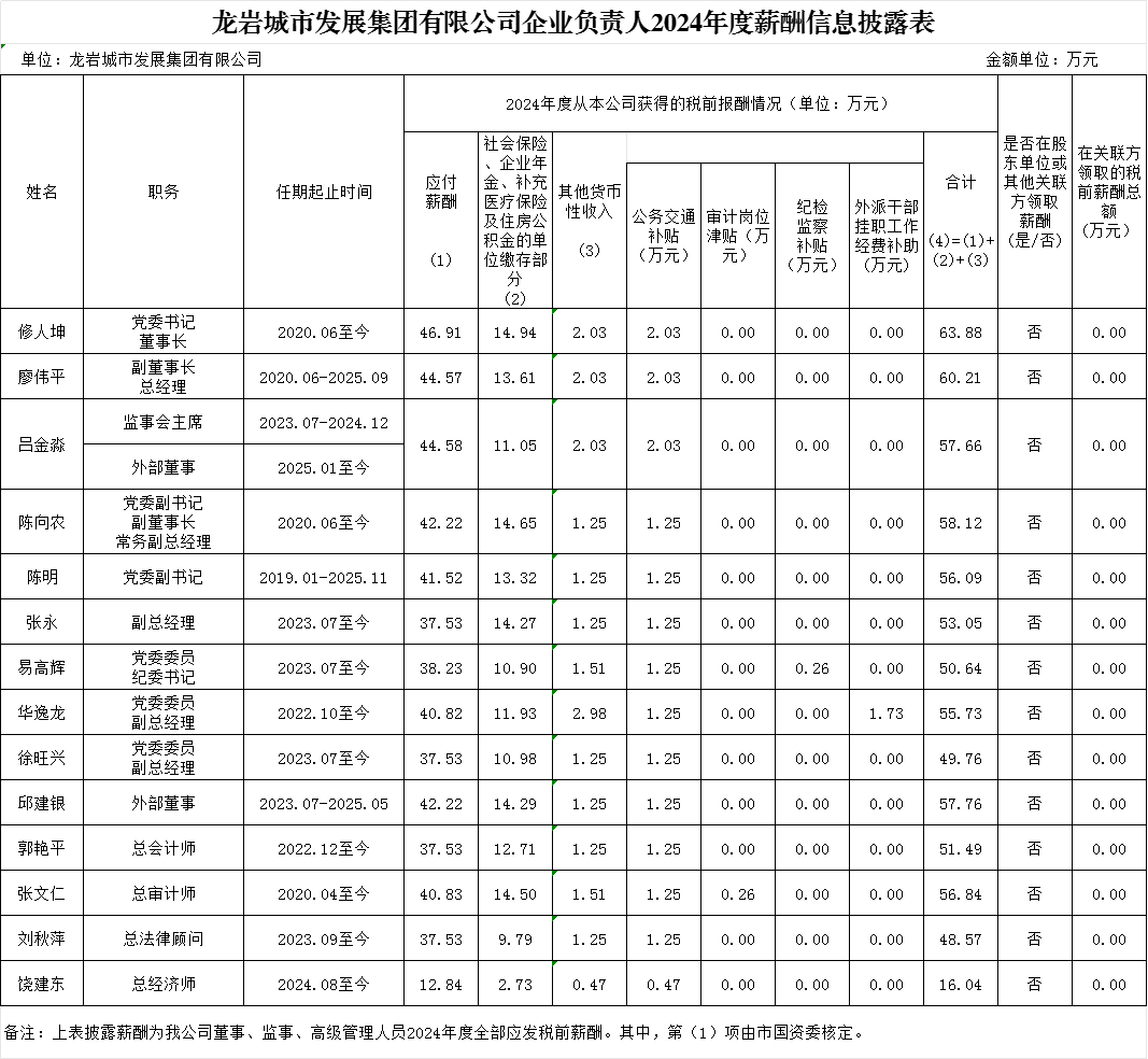 龍巖城市發(fā)展集團有限公司及所屬企業(yè)負責人2024年度薪酬、2022-2024年任期激勵收入信息披露表