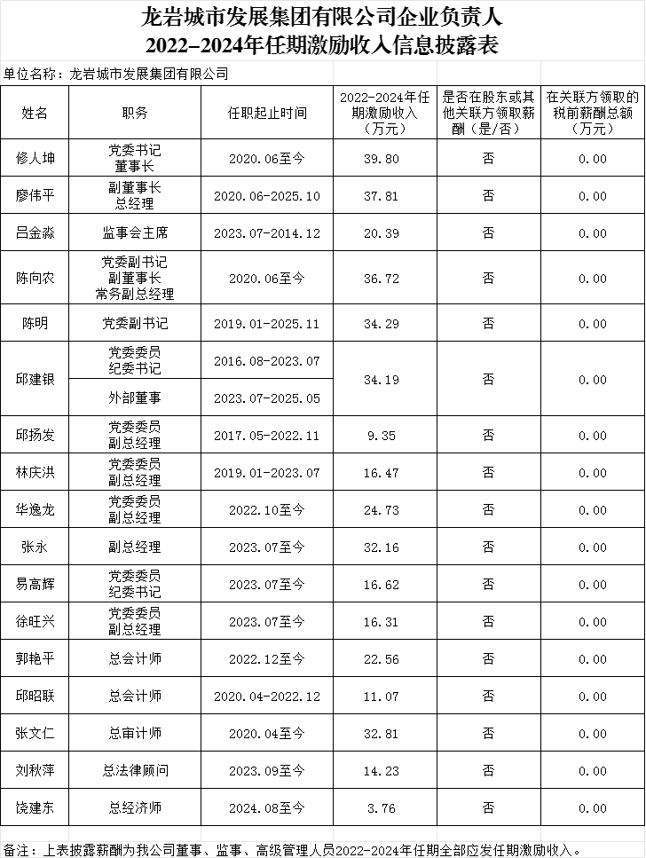 龍巖城市發(fā)展集團有限公司及所屬企業(yè)負責人2024年度薪酬、2022-2024年任期激勵收入信息披露表